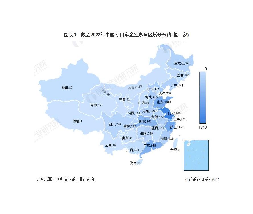 根據中國企業數據庫企查貓,目前中國專用車企業主要分布在江蘇、山東、浙江、廣東、湖北等地,其中江蘇企業數量最多。截至 2022 年 7 月中旬,江蘇共有相關專用車企業數 1843 家。